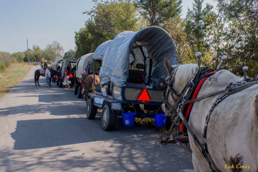 The Kentucky Muleskinners group left Mink's Farm near Harrodsburg, Kentucky on 9/30/19 to spend two weeks driving their wagons southeast across central Kentucky to Renfro Valley and eventually, on south to Barbourville, Ky. The plan was to ride the wagons to the next destination each day and then to return at the end of the day to move up the horse trailers and other vehicles with the animal feed and living quarters. The ride progressed each day with minimal problems although the temperatures for each of the first 4 days exceeded 95°F. This resulted in frequent stops on each of these days to rest and to water the animals. After these first four days, the temperatures came way down and it was almost chilly the rest of the trip. We laid over for two days at Lake Linville near Renfro Valley and participated in the Bittersweet Festival Parade in Mt Vernon, Kentucky on one of those layover days. There was a drought in Kentucky with September being the driest on record, but, of course, the drought broke during our ride with several inches of rain falling on the leg of the trip from Renfro Valley to London. The number of wagons varied each day of the ride from 3 wagons to 8 wagons depending on the weather and other factors. When we got to London, Kentucky we were the guests of Ray Hammons and his family at their farm just outside of London. They have a beautiful place and we laid over there for one day before continuing on. Since we would be arriving in Barbourville on Wednesday with plans to ride in the Daniel Boone Festival Parade on Saturday, some thought was given to riding south towards Tennessee when we left London, but it needed to be scouted out better before we could take the chance. Instead, we went straight on to Barbourville arriving there on Wednesday afternoon. We then laid over there for two days until the parade on Saturday. As we lined up for the parade on Saturday, our only real casualty of the trip occured when Bev Merrill managed to fall from her horse and, it turns out, broke her ankle. As a result, I don't have any photos of the parade because I took Bev to the hospital and was sitting in the emergency room at the hospital while the parade was occurring. Click on the links below to see the photos I took on this adventure. |